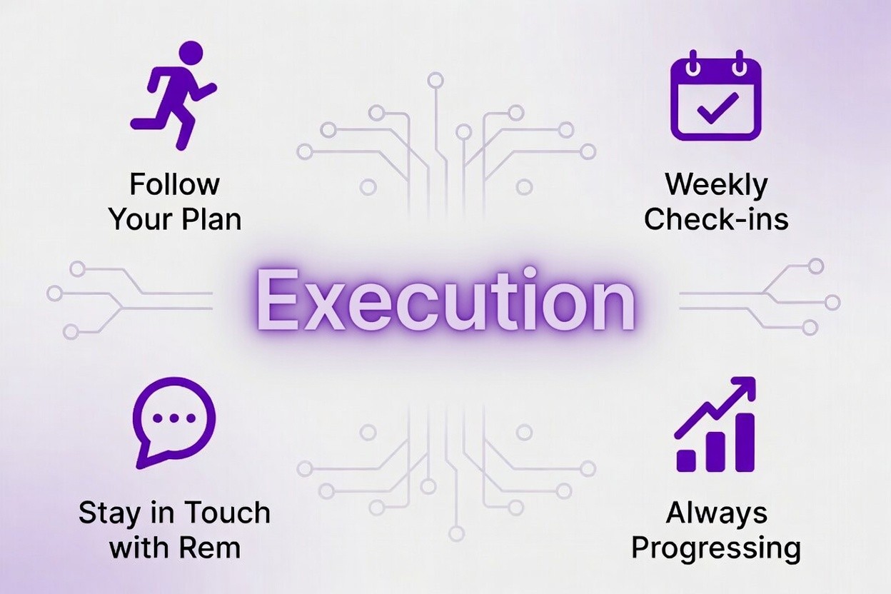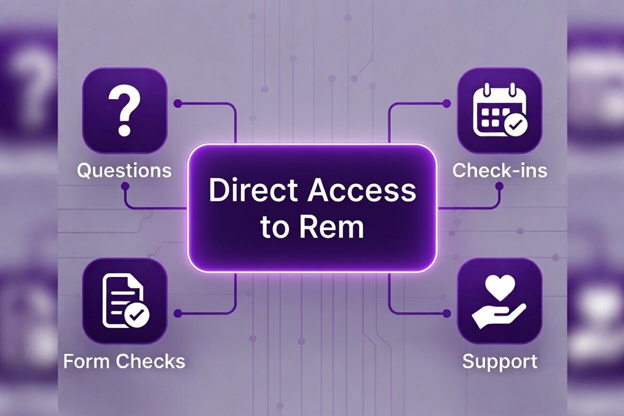 Text Rem anytime with questions, check-ins, form checks, or when you need an extra push.
