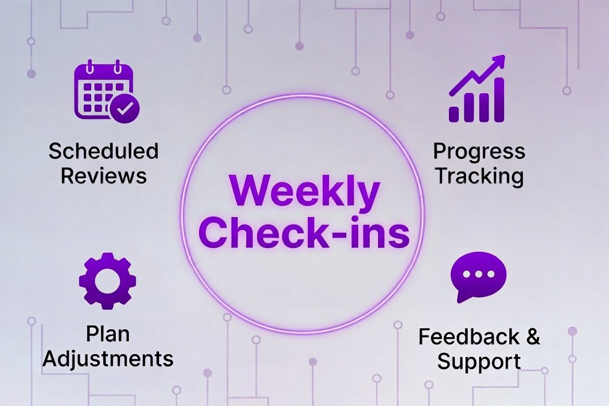 Regular progress reviews and plan adjustments to keep you moving forward.